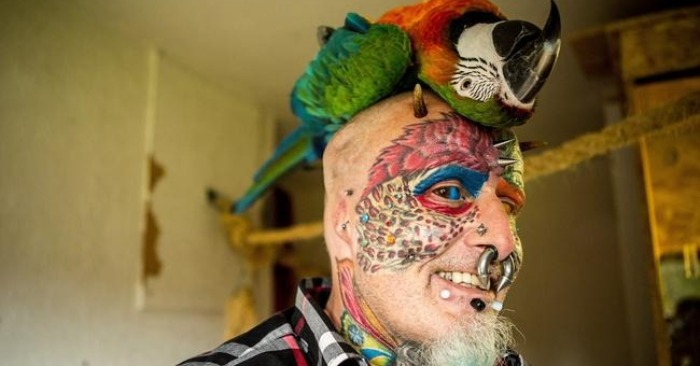 Mas as mudanças mais chocantes são ainda mais extremas. O homem também tatuou os globos oculares e levou sua aparência “de pássaro” tão a sério que removeu as orelhas.