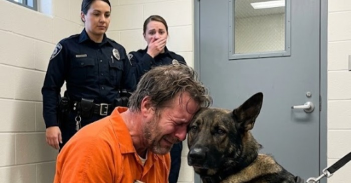 Naquele momento, algo dentro de Ethan se quebrou. Ele se inclinou para a frente o máximo que as algemas permitiam, enterrando o rosto na pelagem do cachorro. Seus ombros tremeram, sua respiração ficou irregular. Não era apenas um choro — anos de dor estavam vindo à tona.