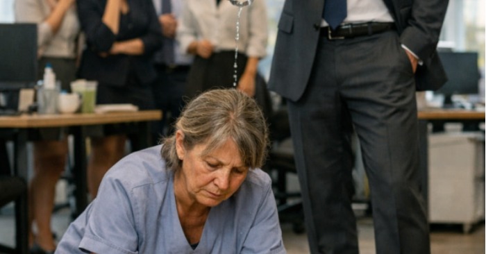Em meio a essa rotina perfeitamente organizada, uma senhora idosa entrou silenciosamente pela porta.