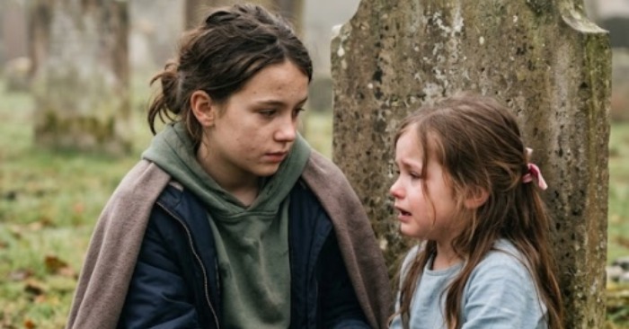 “Eu fugi enquanto o papai dormia…” ela soluçou. “Ele não me deixa vir aqui… mas eu sinto falta da mamãe.”