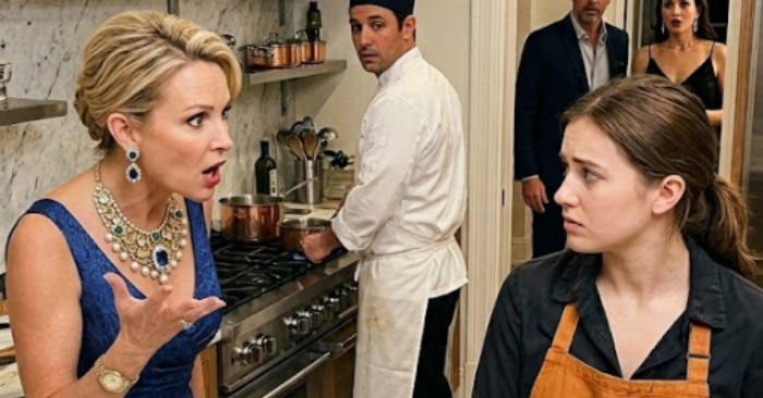 Ela congelou, segurando uma taça de champanhe. Seu rosto perfeito se contorceu por um instante.